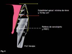 El implante ha de quedar fijo al menos con una fuerza de inserción de 60 Newton cm2 (Fig.6). Dependiendo del diente extraído se elige el implante a colocar: en general, los incisivos centrales y los caninos requieren implantes de 4.5mm, mientras que los implantes de 3,5 mm se usan más para los incisivos inferiores y laterales superiores (Fig. 7).  | | Figs. 8 y 9: Resto radicular con reabsorción dentinaria interna y el implante elegido (Trinon QR de 4.5 por 12mm) traspasando el ápice alveolar 4 mm. Obsérvese cómo las espiras del implante quedan ancladas en la cortical del alveolo debido a su diseño cónico y a la amplitud de las mismas. |