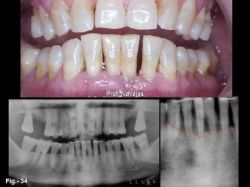 Caso nº 4 Mujer de 62 años que acude a consulta para tratamiento de la movilidad de sus dientes inferiores. De su exploración clínica y radiográfica se diagnóstica como periodontitis crónica del adulto con pérdida de soporte óseo. Los incisivos inferiores son inviables. En la Fig. 34 se puede apreciar la situación clínica y radiográfica de la paciente. Se decide exodoncia de los incisivos inferiores y la colocación de dos implantes inmediatos en situación 32 y 42, para la reposición inmediata de la estética. Durante la implantación, se coloca injerto de Bio-Oss GeistlichnBiomaterials en los alvéolos de 31 y 41, para el mantenimiento de la cresta alveolar. En las figuras 35 y 36 se puede observar la secuencia clínica de la implantación y reposición protética y en la 37 el resultado después de más de 4 años de la implantación.  | |  | | Fig. 34: Situación clínica y radiográfica de la paciente. El aspecto de los tejidos blandos, la apertura de diastemas y la pérdida de soporte óseo ponen de manifiesto la inviabilidad de los incisivos inferiores. | | Fig. 35 a y b: En (a) se observa la situación de los dos implantes Q TrinonR de 3.5 por 14mm de longitud, colocados tras la exodoncia de los incisivos. En (b) la prótesis fija provisional recién colocada. Para mantener la arquitectura de la cresta se colocó un injerto de Bio-Oss Geistlichn Biomaterials en los alvéolos de 31 y 41. | | | | |  | |  | | Fig. 36 a y b: En (a) aspecto de los implantes y tejido gingival antes de colocar la prótesis fija; en (b), la prótesis definitiva recién colocada. La pequeña zona irritada del 32 es debida a sobredimensión de la corona acrílica provisional. | | Fig. 37 a y b: En (a) aspecto de la prótesis definitiva a los cuatro años y cinco meses; en (b), aspecto radiográfico de los implantes a los cuatro años y cinco meses de su inserción. Obsérvese la buena situación de los implantes y la zona del injerto de Bio-Oss Geistlichn Biomaterials en 31-41 |